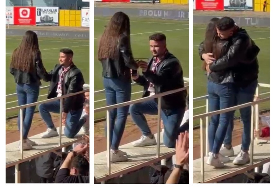 Boluspor ile Erzurumspor arasında oynanan maçtan önce kırmızı-beyazlı takımın tribününden bir genç, kız arkadaşına evlenme teklif etti. “Evet” yanıtını alan genç, “Sude ilk, Boluspor ikinci aşkım” dedi.